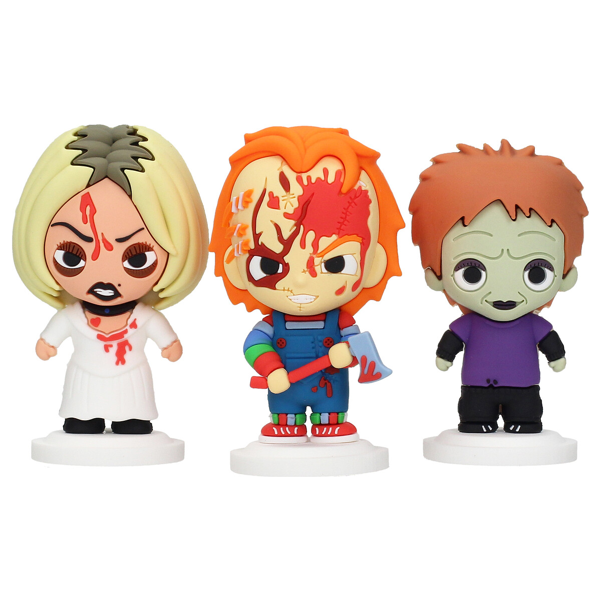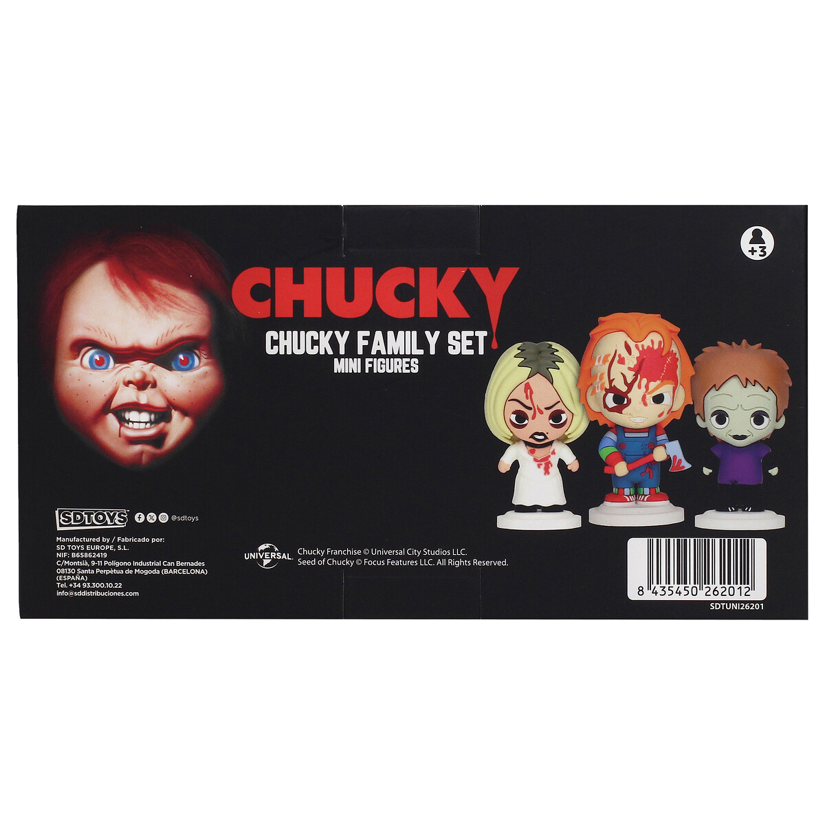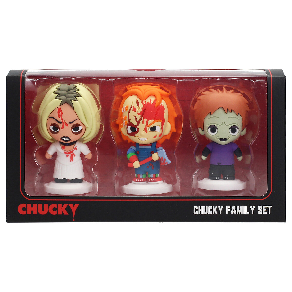 Este set de la icónica familia de terror incluye a Chucky, el infame muñeco «Good Guy» poseído, a su despiadada pareja Tiffany, y al peculiar Glen/Glenda, su hijo de identidad ambigua que aporta un giro inesperado a la franquicia. Cada figura de 7 cm está hecha de goma y captura el lado siniestro y espeluznante de estos personajes que han aterrorizado a los fans desde su primera aparición en los años 80. Desde las travesuras asesinas de Chucky y Tiffany hasta el conflicto interno de Glen/Glenda, este set es una pieza esencial para coleccionistas que quieran añadir toda la retorcida dinámica familiar de Child’s Play a su colección.