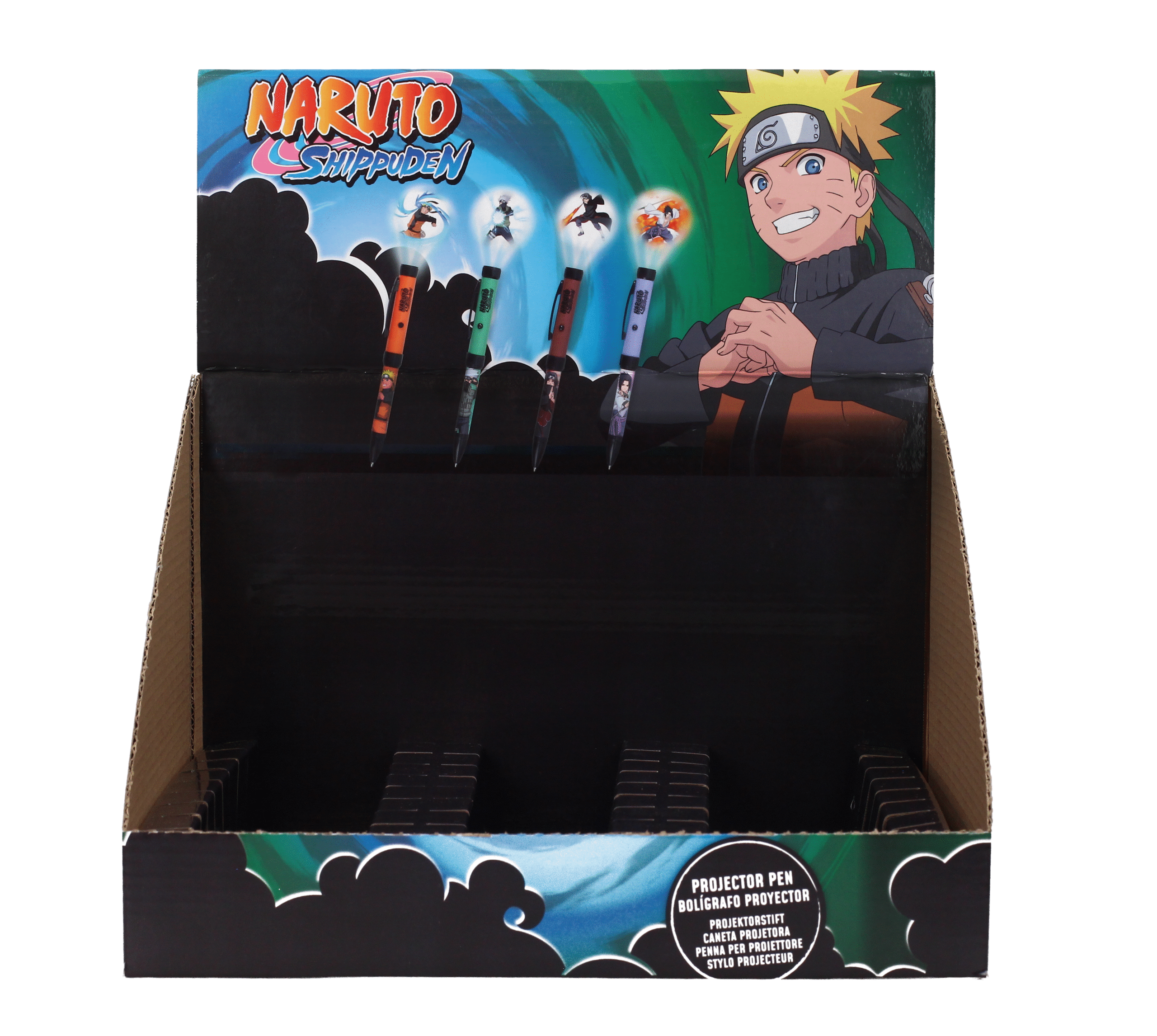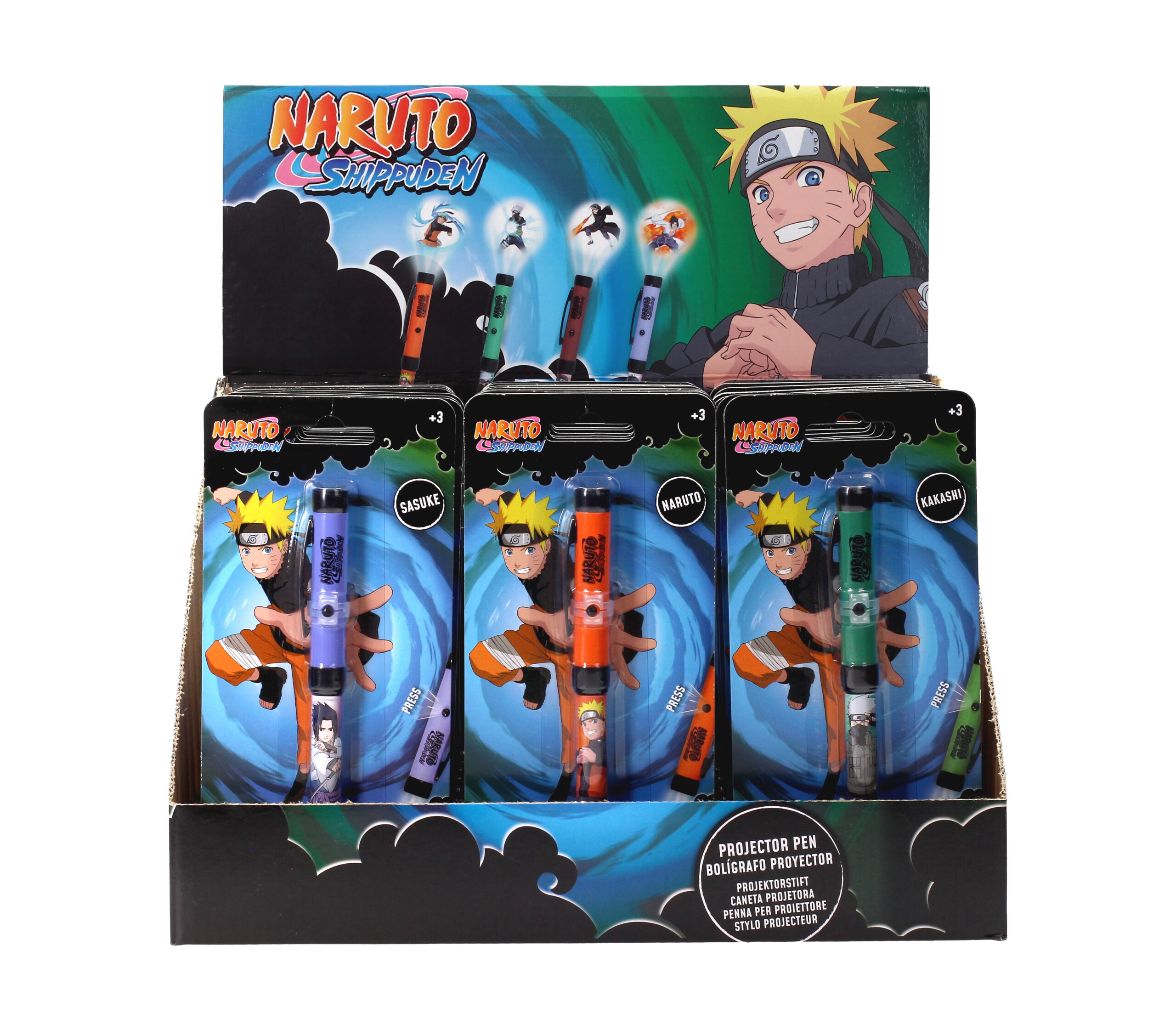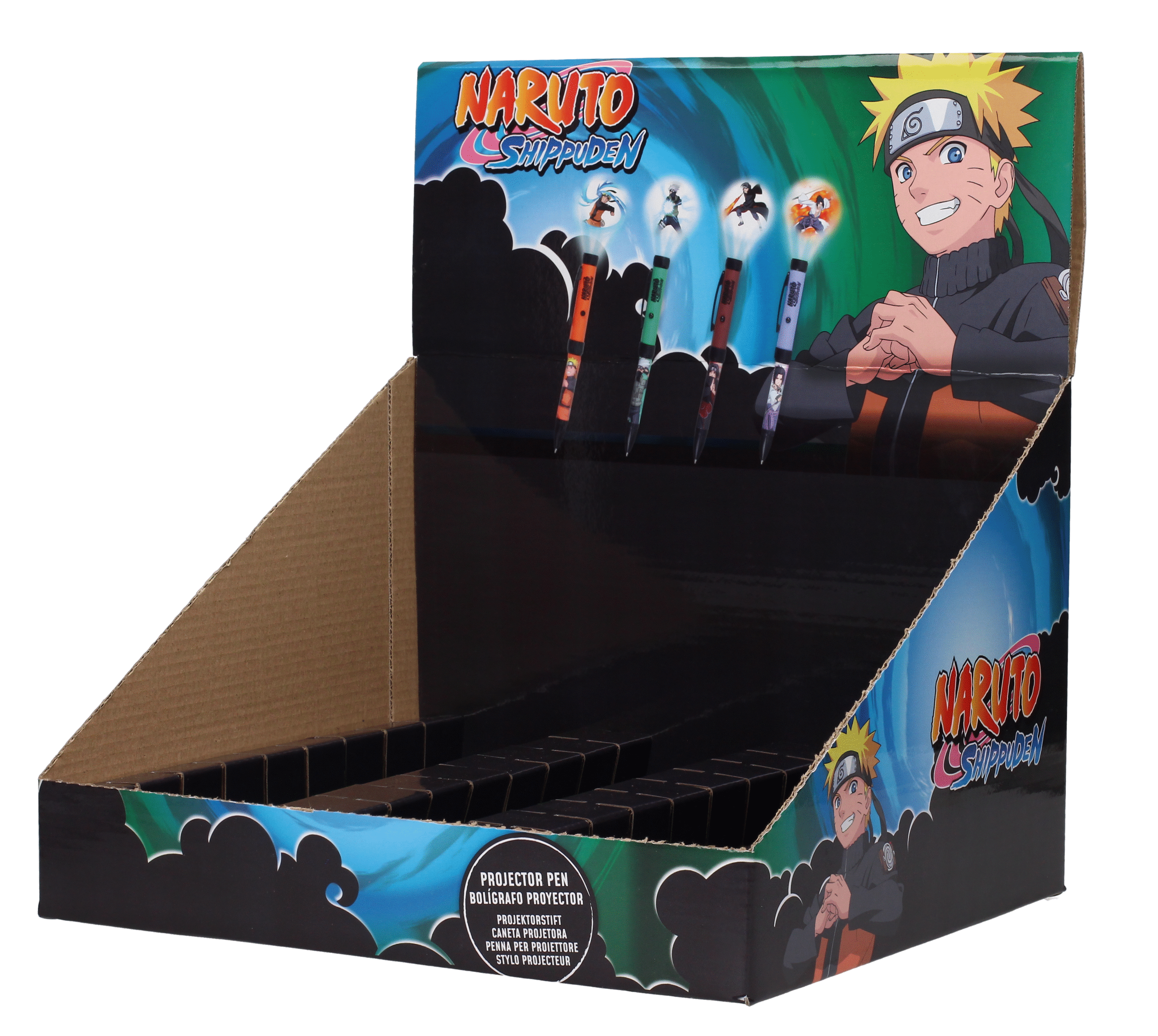 SD TOYS presenta, dentro de la colección de  bolígrafos de la serie de animación «Naruto Shippuden», este expositor de 24 unidades de bolígrafos proyectores de luz de los personajes de «Naruto». Este expositor está compuesto por bolígrafos de Nartuo, Kakashi, Itachi y Sasuke. Con ellos no solo podrás escribir, también podrás utilizarlo de proyector con luz.