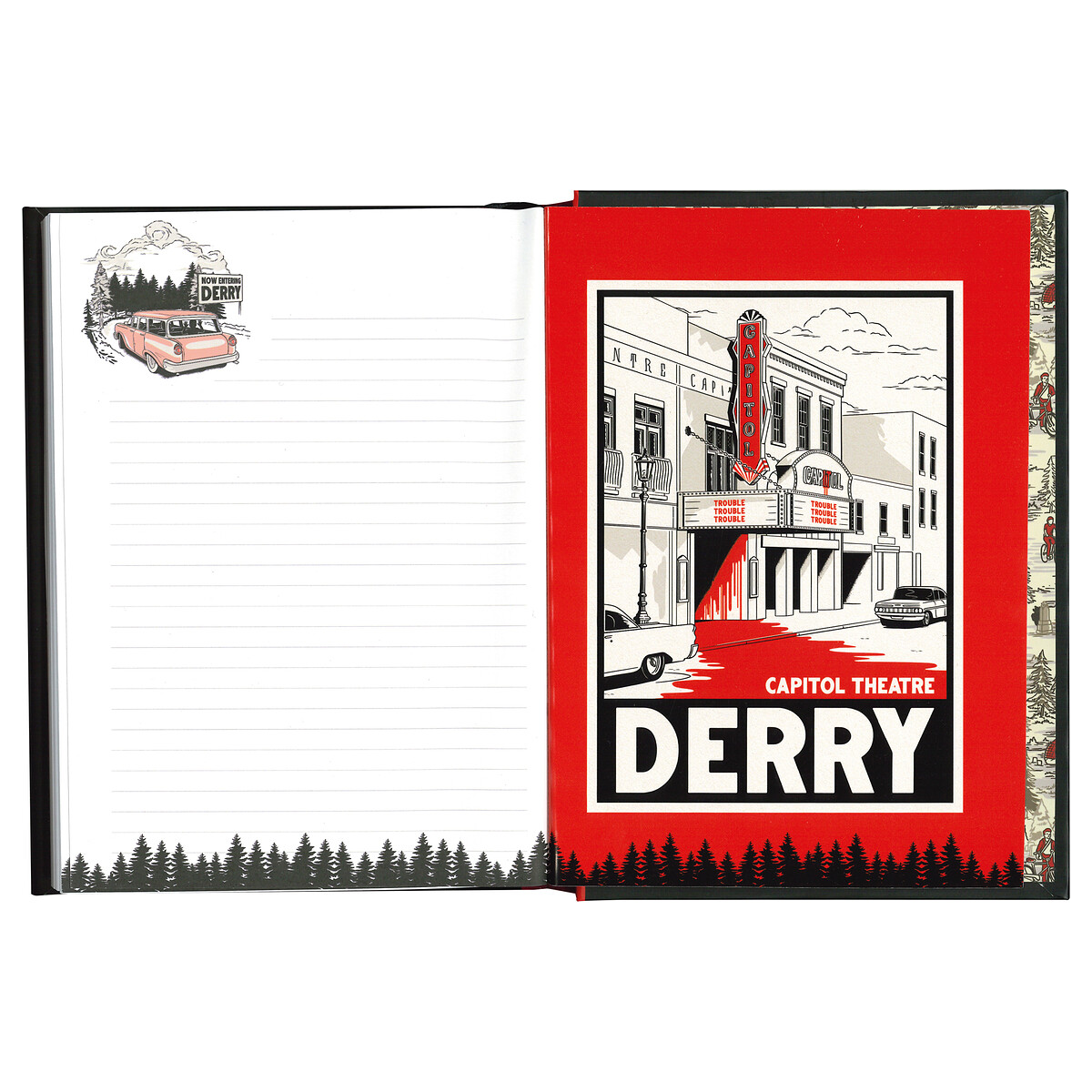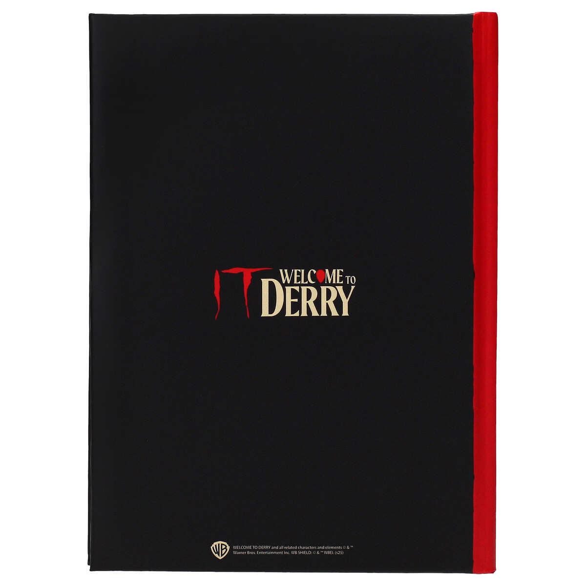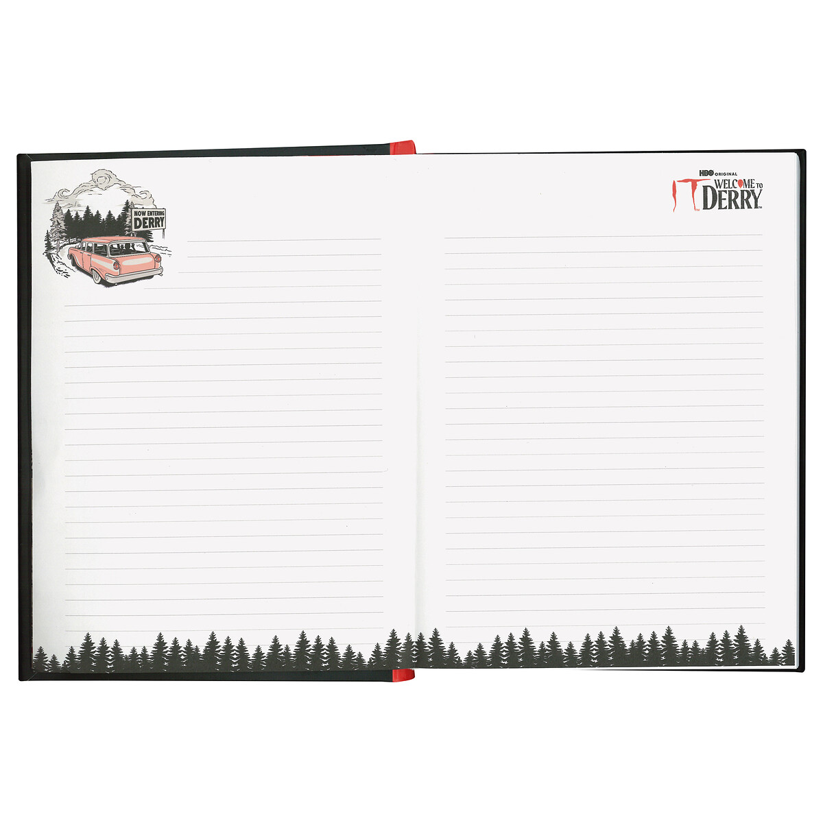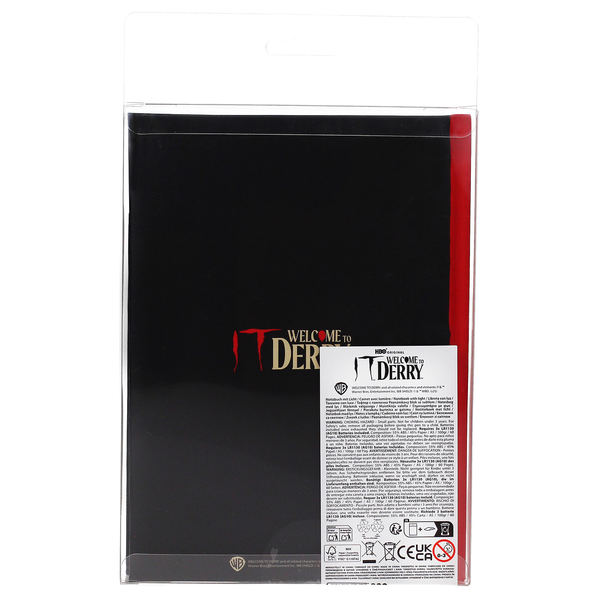 Libreta Welcome to Derry con un diseño tan inquietante como icónico. Su portada negra esconde unos ojos que se iluminan, recreando la presencia constante de Pennywise y la atmósfera oscura del pueblo de Derry. En el interior, cada página incluye detalles gráficos inspirados en la serie, con referencias a lugares y escenas clave que los fans reconocerán al instante.