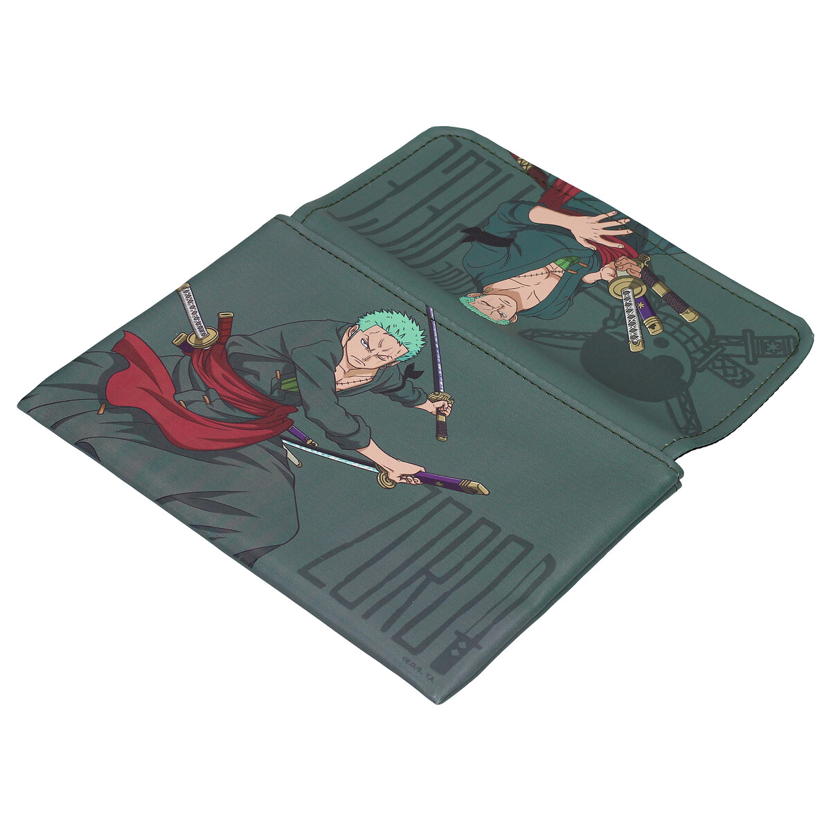 El cazador de piratas Roronoa Zoro protagoniza este diseño en tonos verdes. Un portamanga que refleja disciplina, fuerza y la lealtad del espadachín de los Sombrero de Paja.