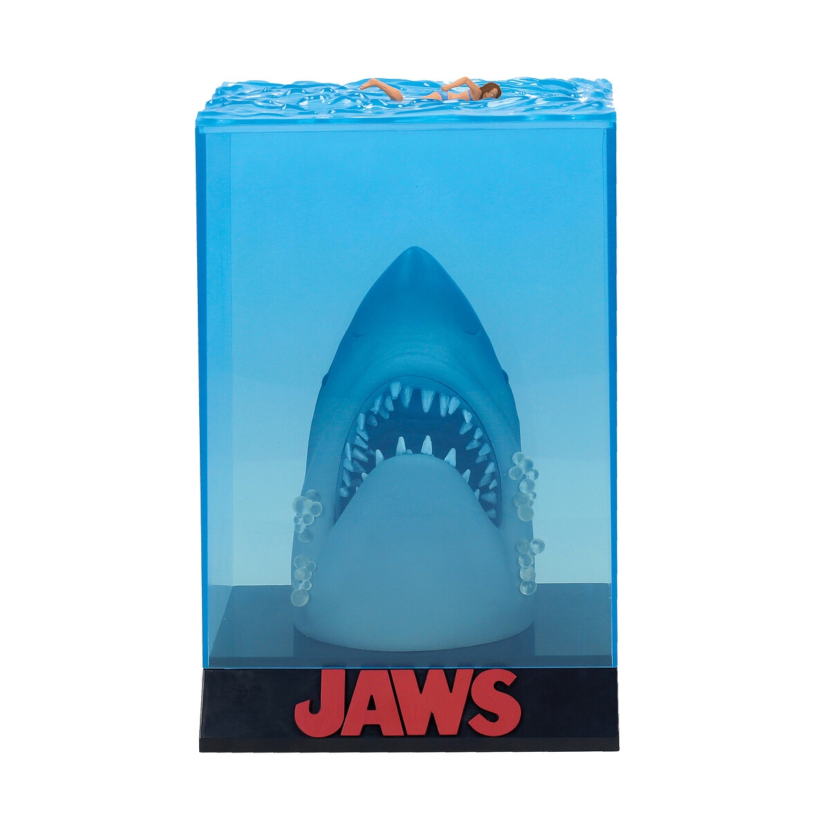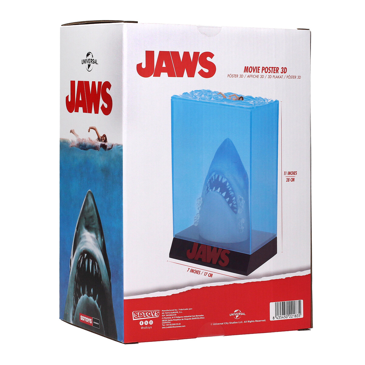 ¡Sumérgete en el terror clásico con nuestra figura coleccionable de «Jaws»! Esta impresionante pieza, con medidas de 26 cm x 17 cm x 10 cm, captura a la perfección la icónica escena del póster de la película, donde el gigantesco tiburón emerge de las profundidades para atacar a una nadadora desprevenida. Hecha con materiales de alta calidad, esta figura no solo es un tributo a la película que redefinió el género de thriller de monstruos, sino también un impresionante objeto de decoración para cualquier fanático del cine.Dirigida por Steven Spielberg y estrenada en 1975, «Jaws» se convirtió en un fenómeno cultural, estableciendo el modelo del éxito veraniego y generando una paranoia en torno a los tiburones que aún persiste. La película ganó tres premios Oscar y se ha mantenido como un referente en la historia del cine, conocida por su emocionante banda sonora compuesta por John Williams y su innovador uso de efectos especiales.Añade esta figura de «Jaws» a tu colección y revive el escalofrío cada vez que la veas. Ideal para exhibir en tu sala, oficina o espacio de entretenimiento, es un regalo perfecto para los amantes del cine clásico y del terror. ¡No pierdas la oportunidad de poseer un pedazo de historia cinematográfica y haz tu pedido hoy mismo!