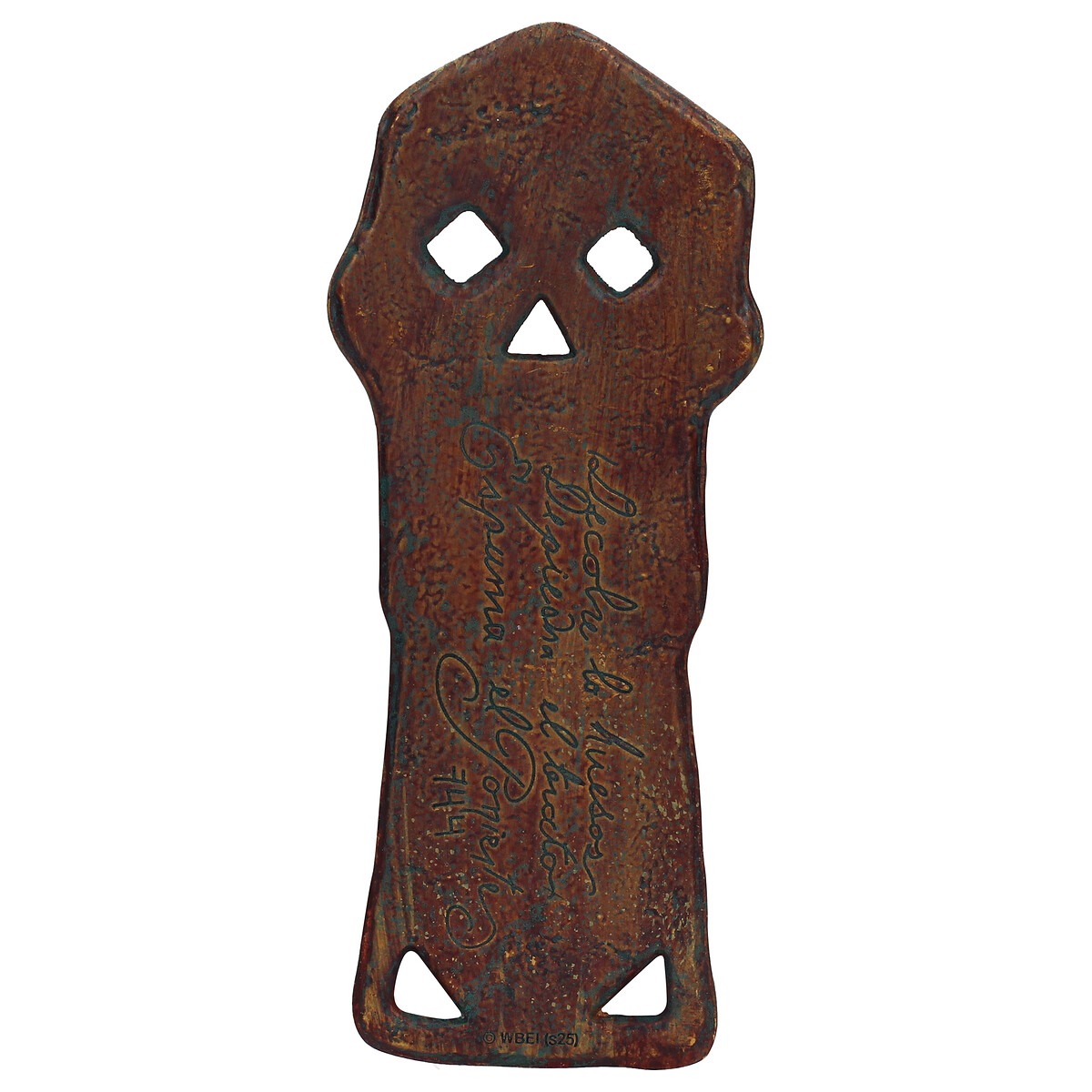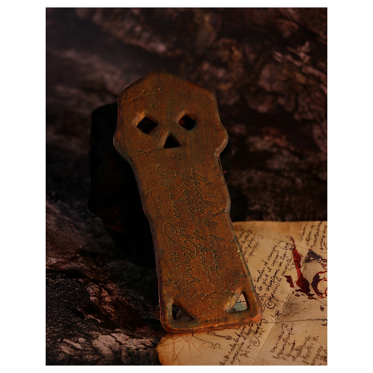 Forjada en metal sólido, esta réplica reproduce con precisión los detalles y el acabado envejecido del accesorio original de la película. En su reverso lleva grabada la frase: