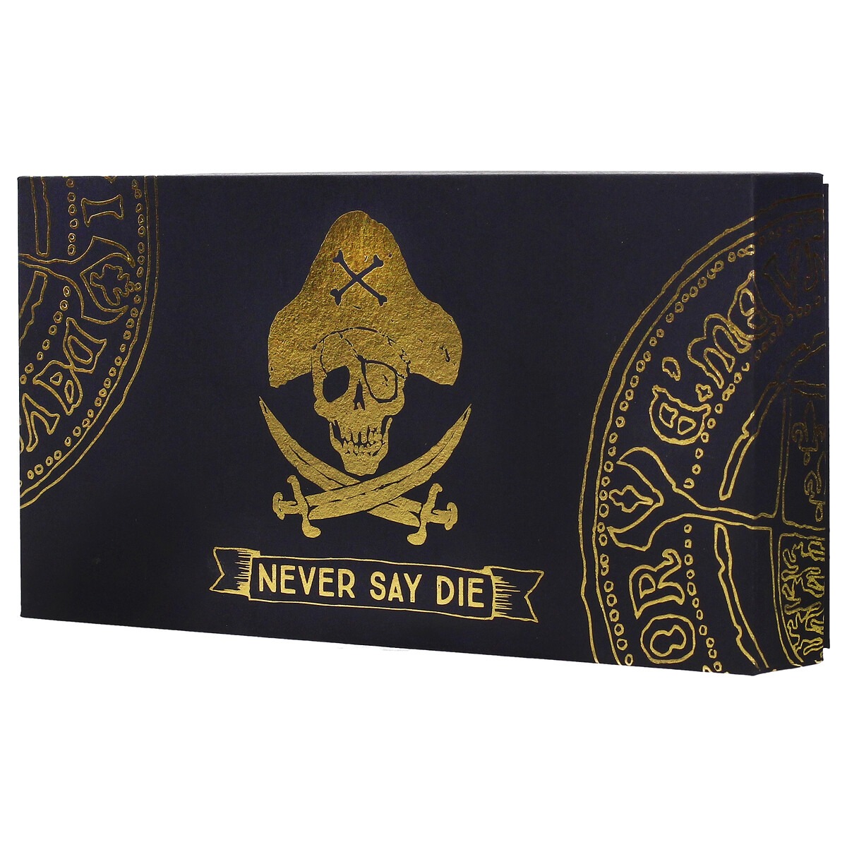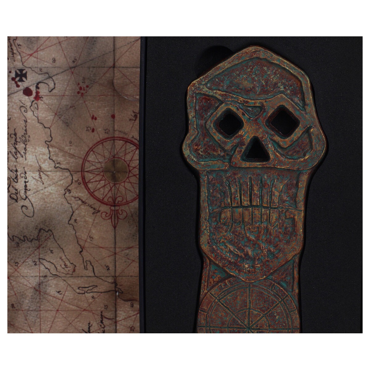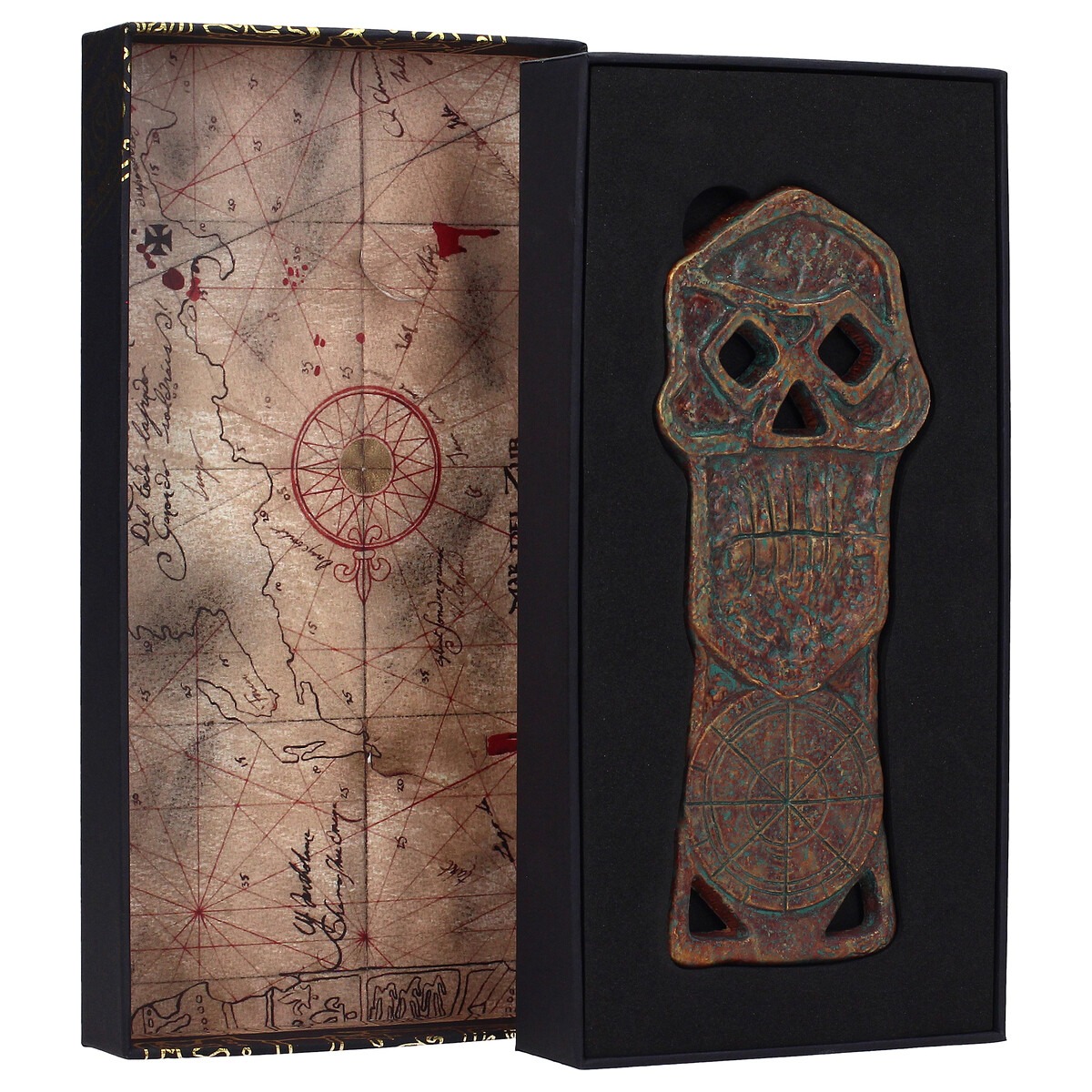Con medidas de 17 x 1 x 7 cm y un peso de 450 g, ofrece una sensación realista y una presencia destacada al exhibirse. Su presentación en caja con decoración en barniz dorado resalta los símbolos y emblemas piratas del film, ideal para mostrar o conservar como pieza de colección.