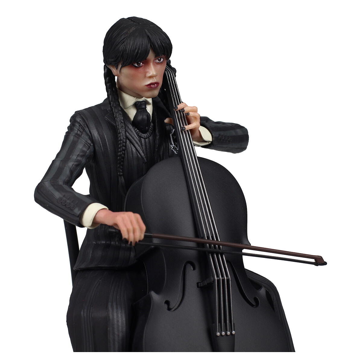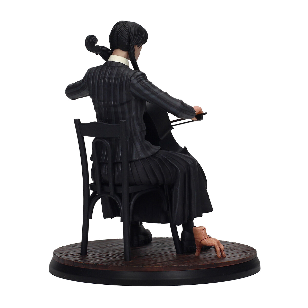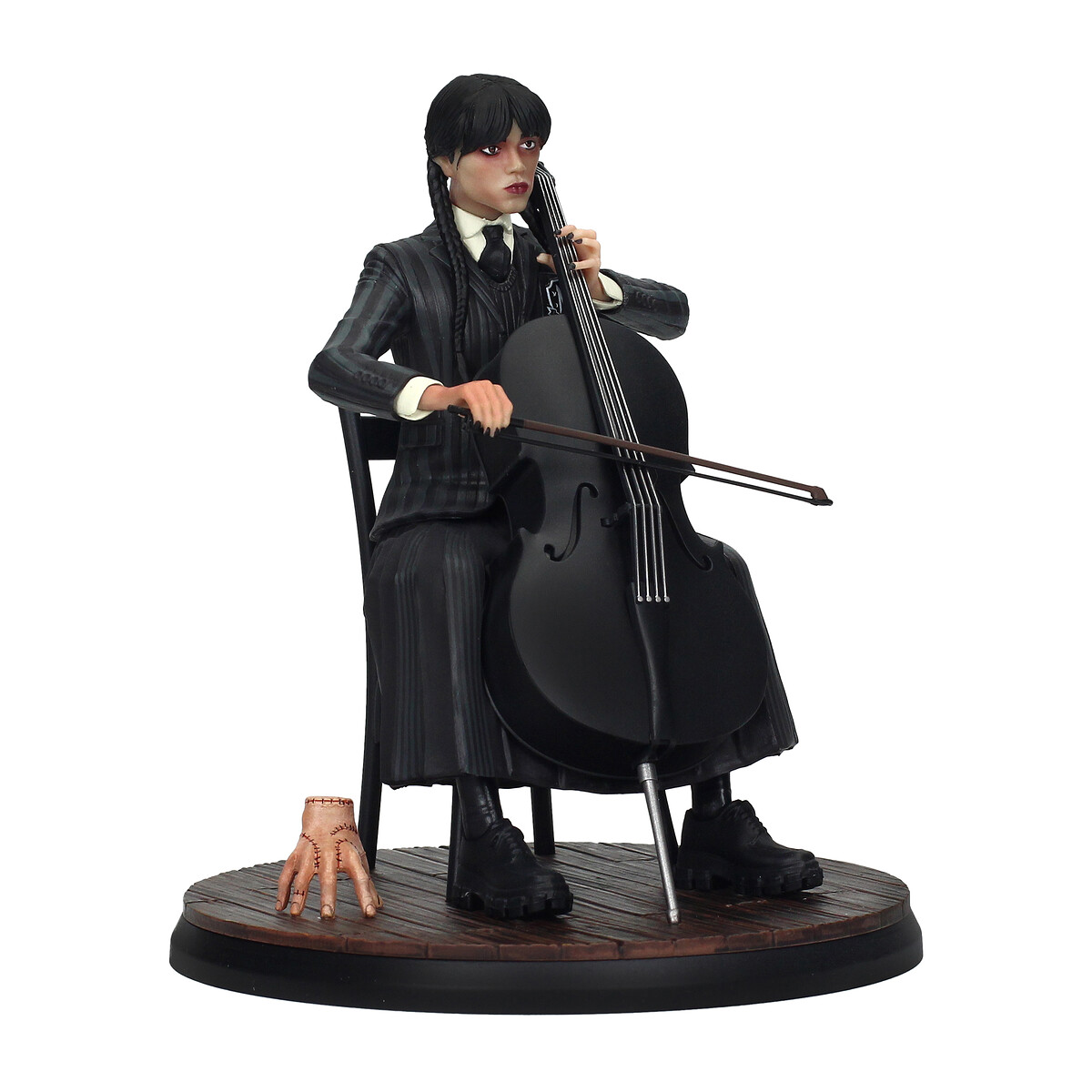¡Déjate encantar por la figura de Wednesday Addams inspirada en la serie de Tim Burton y magníficamente interpretada por Jenna Ortega! Esta figura captura una escena mágica donde Wednesday interpreta magistralmente la canción “Paint it Black” de los Rolling Stones con su violonchelo desde su balcón, envuelta en la atmósfera misteriosa donde observamos todos los acontecimientos que la rodean. Vestida con su conjunto característico de zapatos negros, falda larga, chaqueta a rayas gris oscuro, chaleco de punto negro, camisa blanca y corbata negra, el peinado distintivo de Wednesday, con su flequillo y dos trenzas largas, junto con las uñas pintadas de negro, se suman al estilo único de esta pieza. encanto. Y, por supuesto, está acompañada por el guardián de la familia Addams, Thing, con sus intrincados bordados a su costado.¡Esta figura es imprescindible para todos los fanáticos!