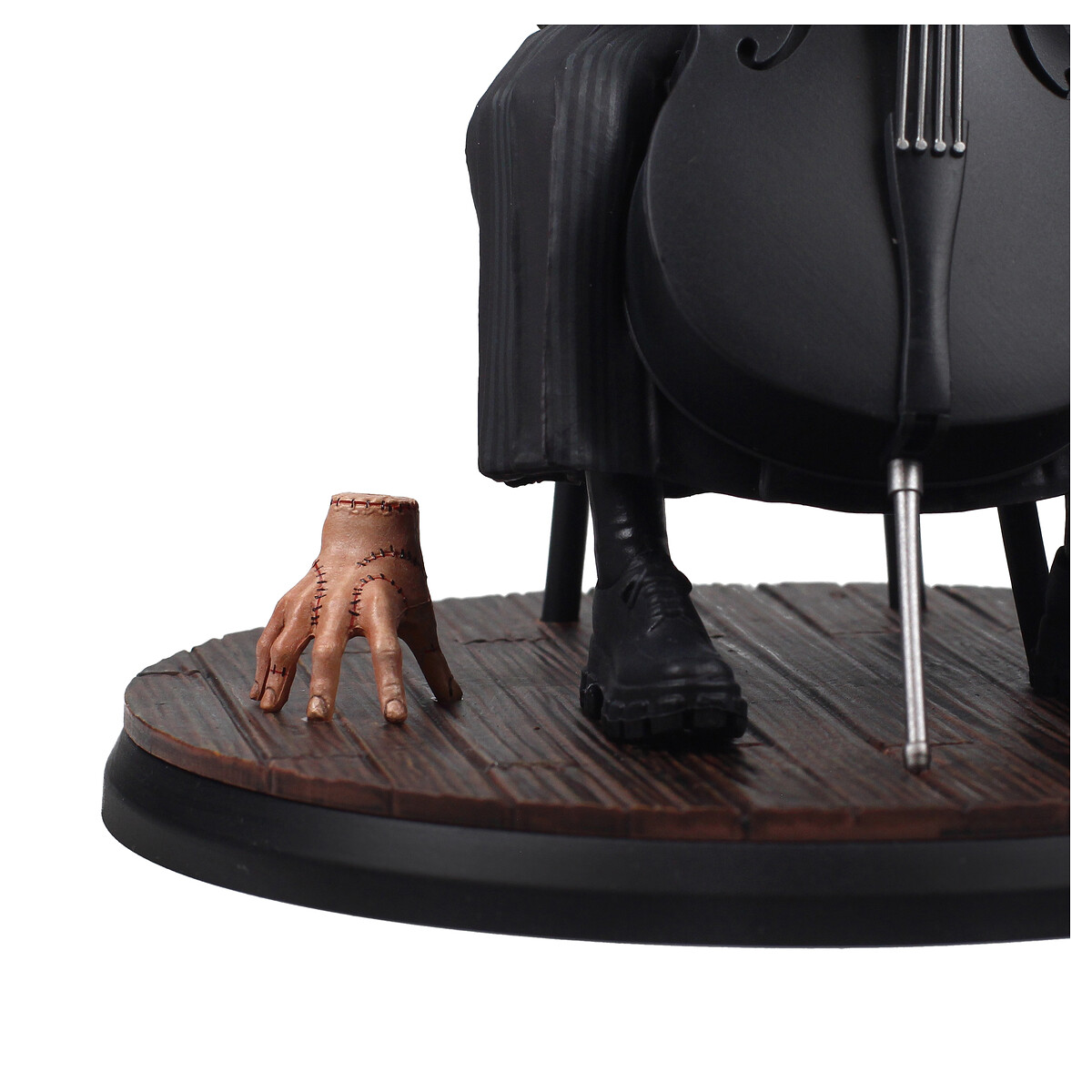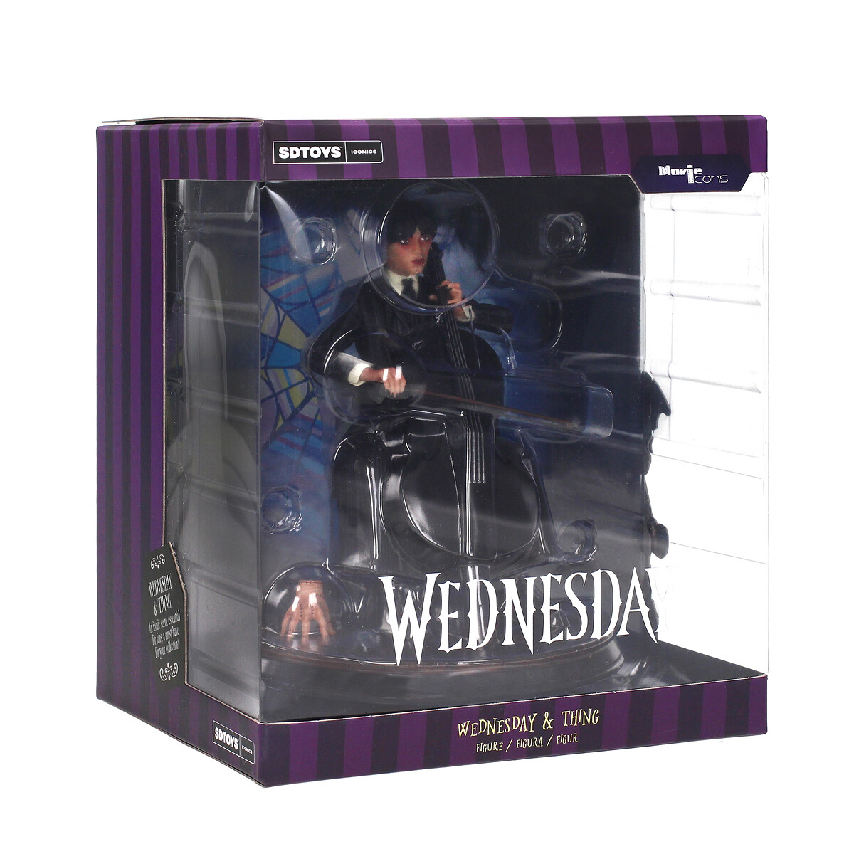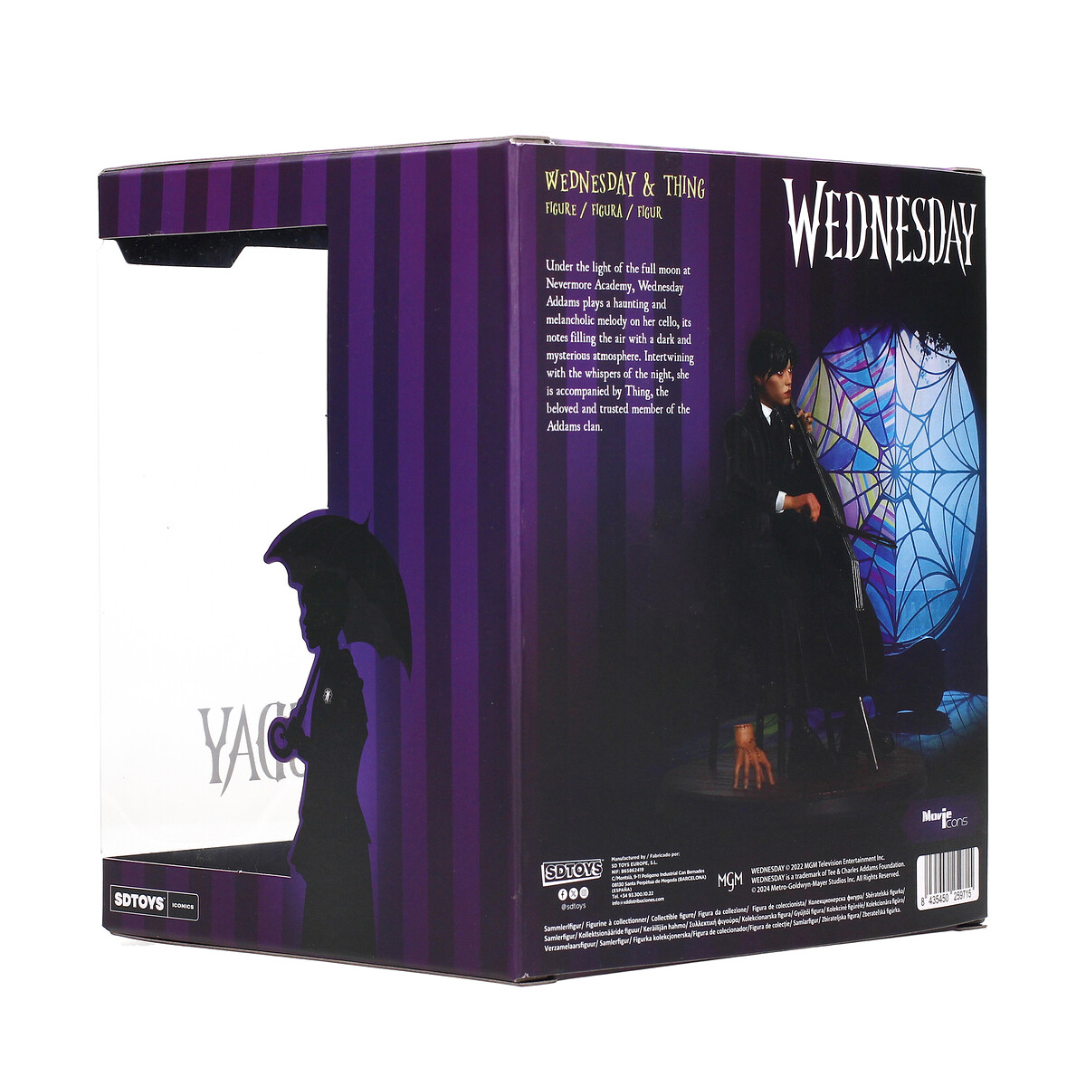 ¡Déjate encantar por la figura de Wednesday Addams inspirada en la serie de Tim Burton y magníficamente interpretada por Jenna Ortega! Esta figura captura una escena mágica donde Wednesday interpreta magistralmente la canción “Paint it Black” de los Rolling Stones con su violonchelo desde su balcón, envuelta en la atmósfera misteriosa donde observamos todos los acontecimientos que la rodean. Vestida con su conjunto característico de zapatos negros, falda larga, chaqueta a rayas gris oscuro, chaleco de punto negro, camisa blanca y corbata negra, el peinado distintivo de Wednesday, con su flequillo y dos trenzas largas, junto con las uñas pintadas de negro, se suman al estilo único de esta pieza. encanto. Y, por supuesto, está acompañada por el guardián de la familia Addams, Thing, con sus intrincados bordados a su costado.¡Esta figura es imprescindible para todos los fanáticos!
