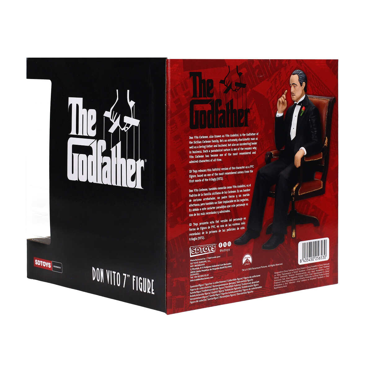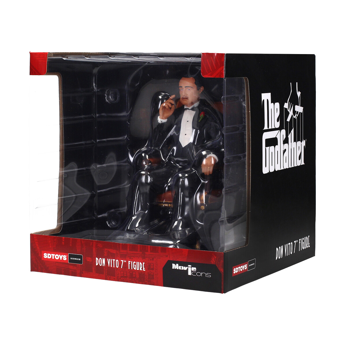 Don Vito Corleone, también conocido como Vito Andolini, es el Padrino de la familia siciliana de los Corleone. Es un hombre de carisma arrebatador, un padre tierno y un marido afectuoso, pero también un líder implacable em los negocios. Es debido a este carácter paradójico que este personaje es uno de los más recordados y admirados.SD Toys presenta esta fiel versión del personaje de forma de figura de PVC, en unas de las escenas más recordadas de la primera de las películas de esta trilogía (1972).