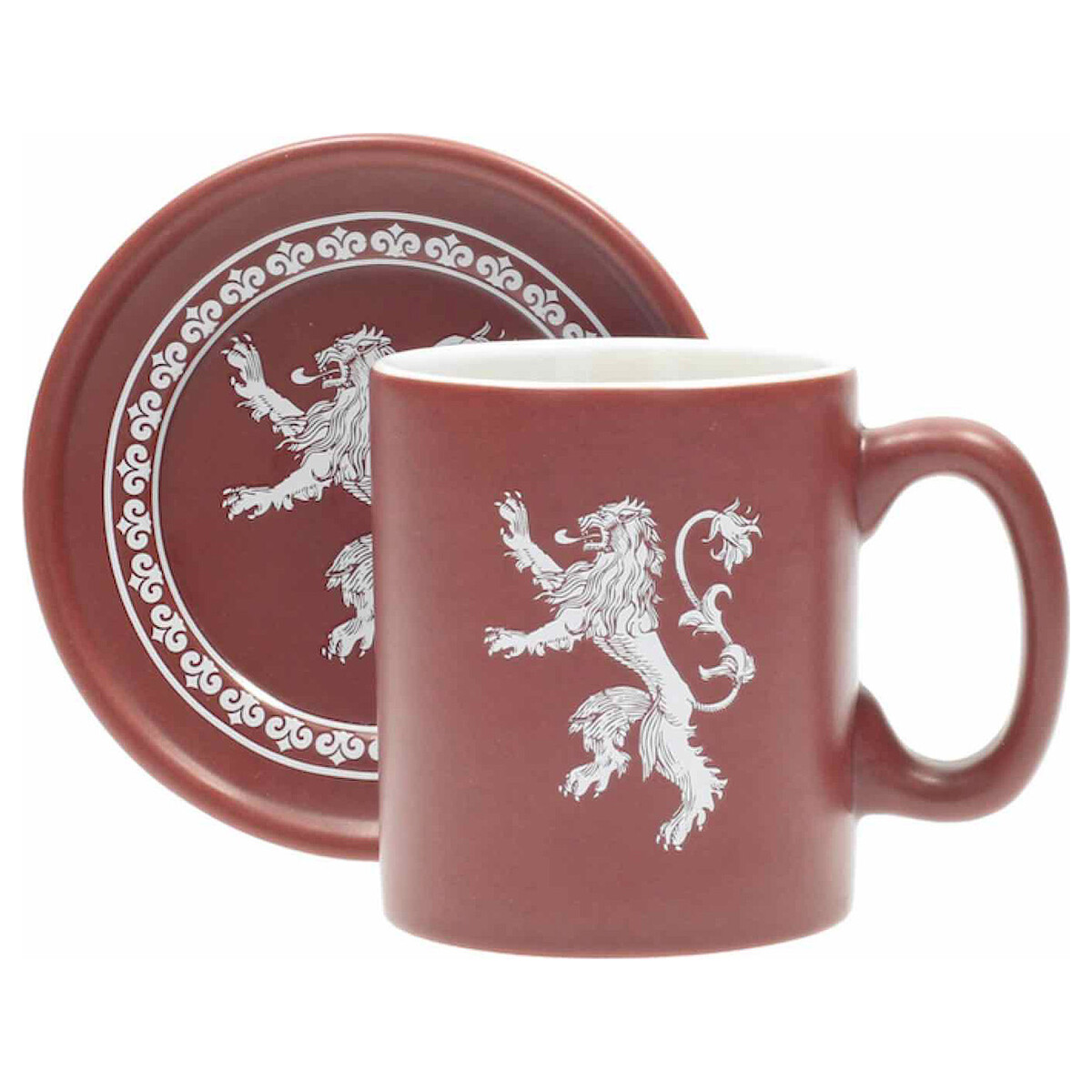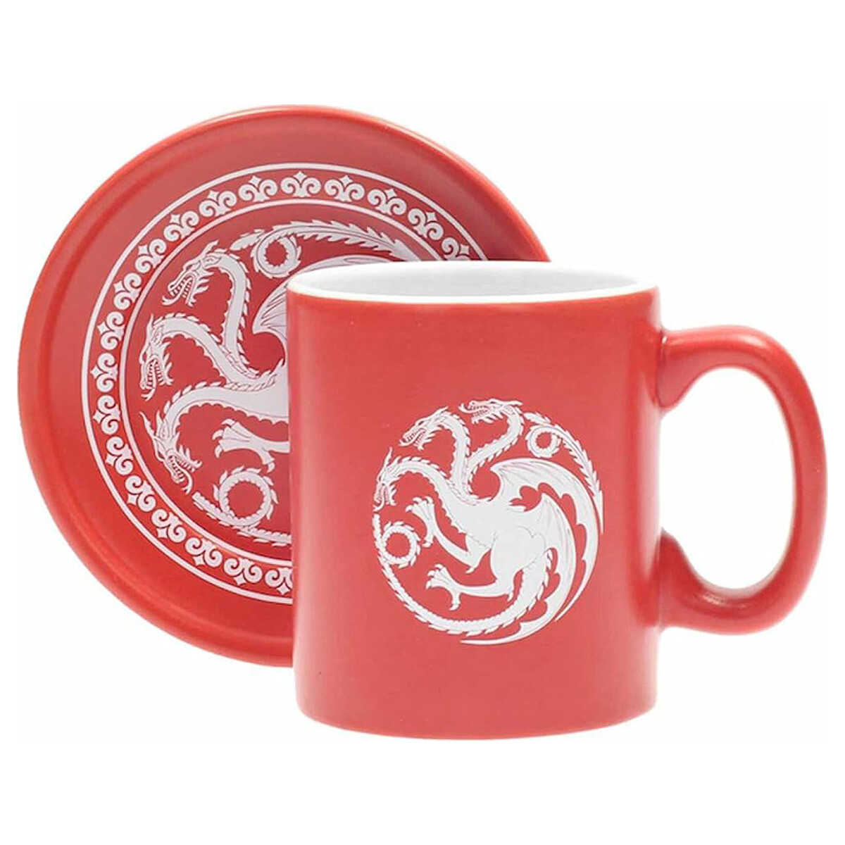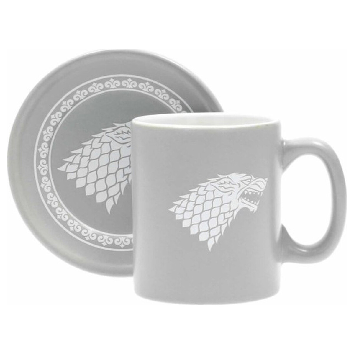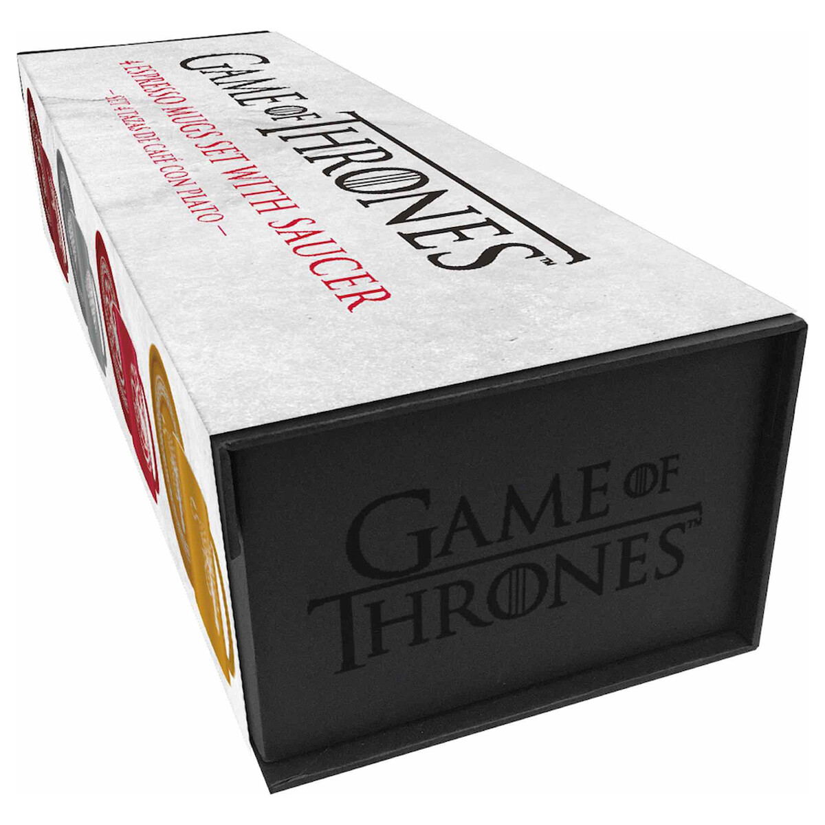 SD Toys presenta este espectacular set de cuatro mini tazas de café, cada una adornada con el emblema y lema de las casas Stark, Lannister, Targaryen y Greyjoy de la aclamada serie de TV «Game of Thrones». Complementando estas tazas, encontrarás cuatro platos bellamente ilustrados con los emblemas respectivos de cada casa. Fabricados en cerámica mate de alta calidad, tanto las tazas como los platos vienen en tonos distintivos y elegantes. Este conjunto viene presentado en una lujosa caja con cierre magnético, resguardada por una banda impresa con detalles brillantes que realzan su belleza.