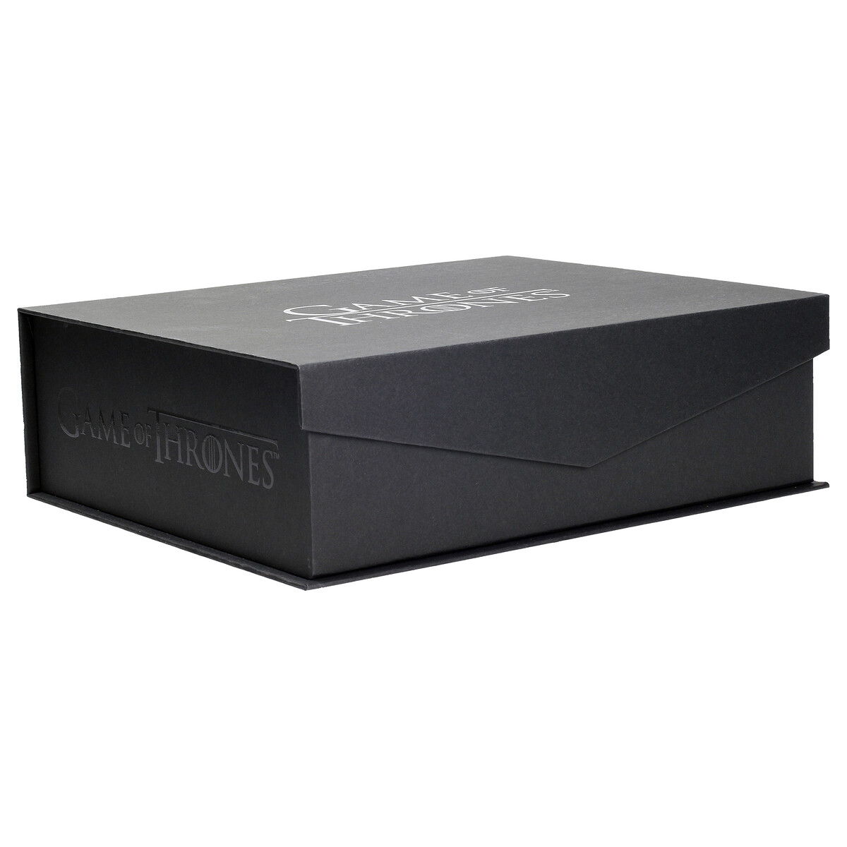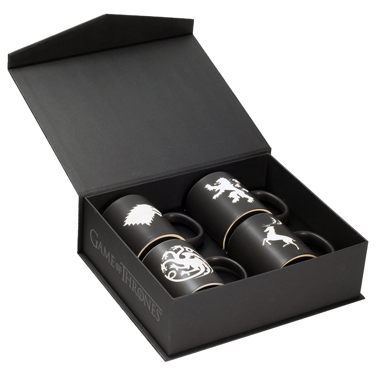 SD Toys lanza a la venta este set de cuatro tazas con los emblemas de las casas más icónocas de la serie «Game of Thrones», en blanco y negro. La base de las tazas es de un elegante color negro mate y los diseños de las mismas están grabados a láser (bajo relieve). Se presentan en una caja de lujo con cierre magnético, protegida por una banda impresa con áreas destacadas en brillo. Se trata de una edición limitada a 4000 sets en todo el mundo, que incluye una tarjeta numerada a mano.